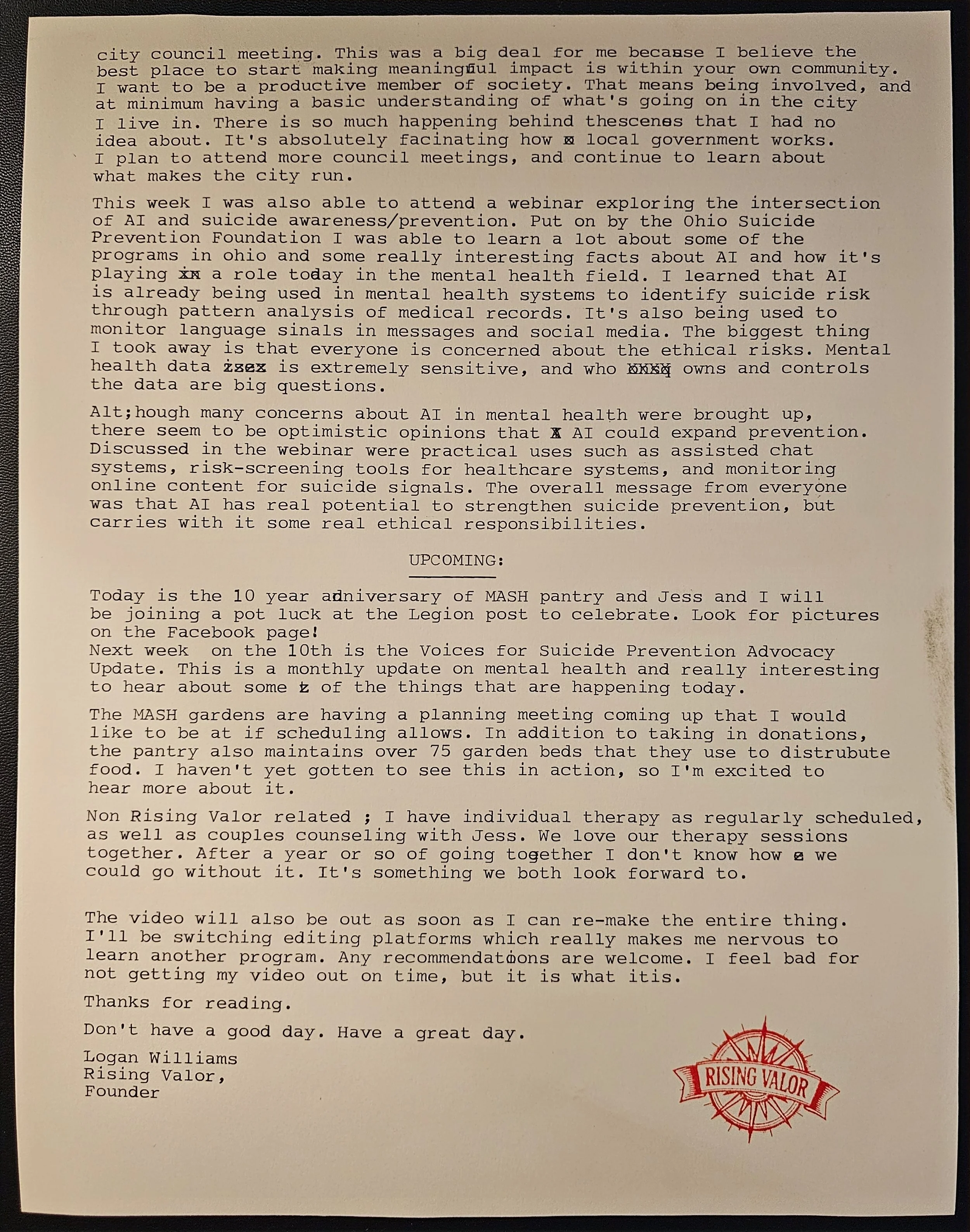 This week I was also able to attend a webinar exploring the intersection of AI and suicide awareness/prevention. Put on by the Ohio Suicide Prevention Foundation I was able to learn a lot about some of the programs in ohio and some really interesting facts about AI and how it's playing a role today in the mental health field. I learned that AI is already being used in mental health systems to identify suicide risk through pattern analysis of medical records. It's also being used to monitor language signals in messages and social media. The biggest thing I took away is that everyone is concerned about the ethical risks. Mental health data is extremely sensitive, and who owns and controls the data are big questions.