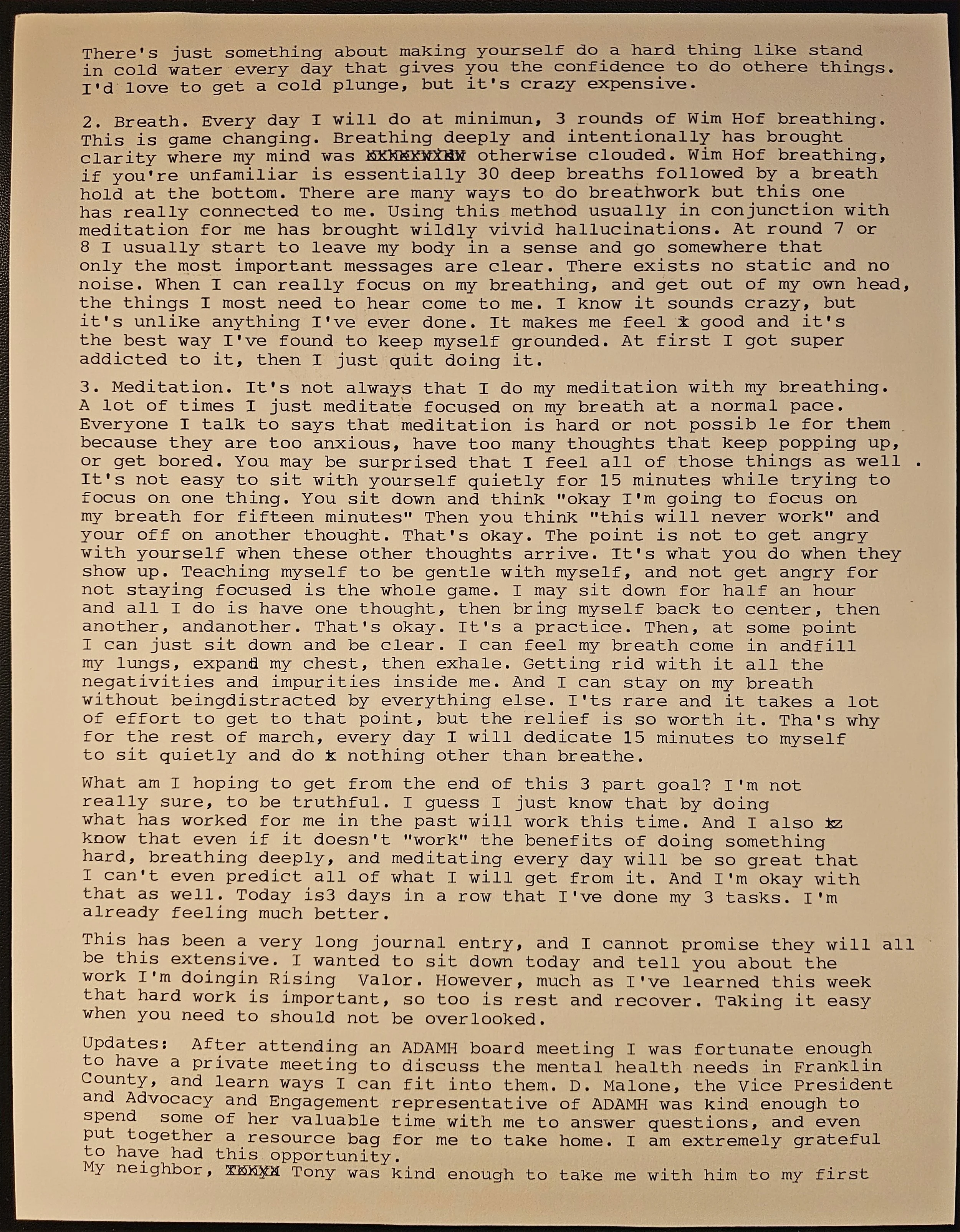Breath. Every day I will do at minimum, 3 rounds of Wim Hof breathing. This is game changing. Breathing deeply and intentionally has brought clarity where my mind was otherwise clouded. Wim Hof breathing, if you're unfamiliar is essentially 30 deep breaths followed by a breath hold at the bottom. There are many ways to do breathwork but this one has really connected to me. Using this method usually in conjunction with meditation for me has brought wildly vivid hallucinations. At round 7 or 8 I usually start to leave my body in a sense and go somewhere that only the most important messages are clear. There exists no static and no noise. When I can really focus on my breathing, and get out of my own head, the things I most need to hear come to me. I know it sounds crazy, but it's unlike anything I've ever done. It makes me feel good and it's the best way I've found to keep myself grounded. At first I got super addicted to it, then I just quit doing it.
