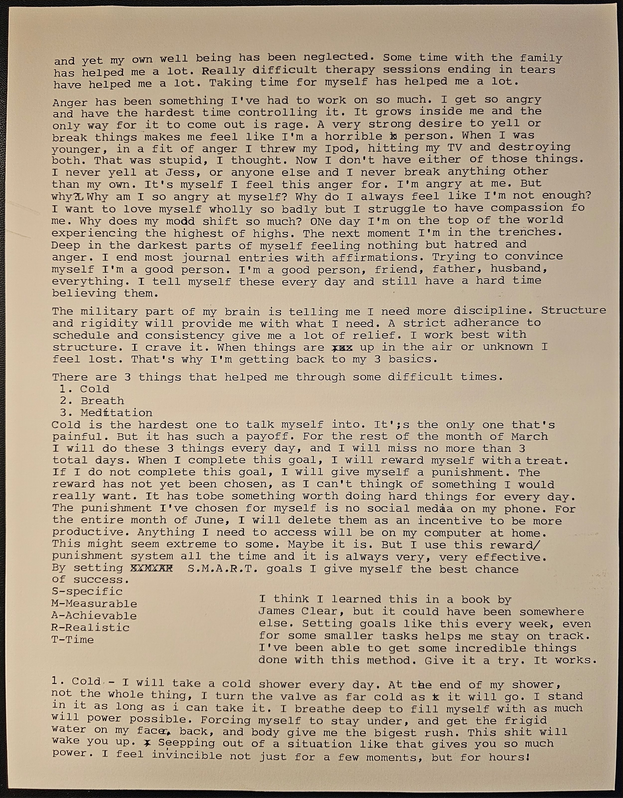 Cold is the hardest one to talk myself into. It's the only one that's painful. But it has such a payoff. For the rest of the month of March I will do these 3 things every day, and I will miss no more than 3 total days. When I complete this goal, I will reward myself with a treat. If I do not complete this goal, I will give myself a punishment. The reward has not yet been chosen, as I can't think of something I would really want. It has to be something worth doing hard things for every day. The punishment I've chosen for myself is no social media on my phone. For the entire month of June, I will delete them as an incentive to be more productive. Anything I need to access will be on my computer at home.