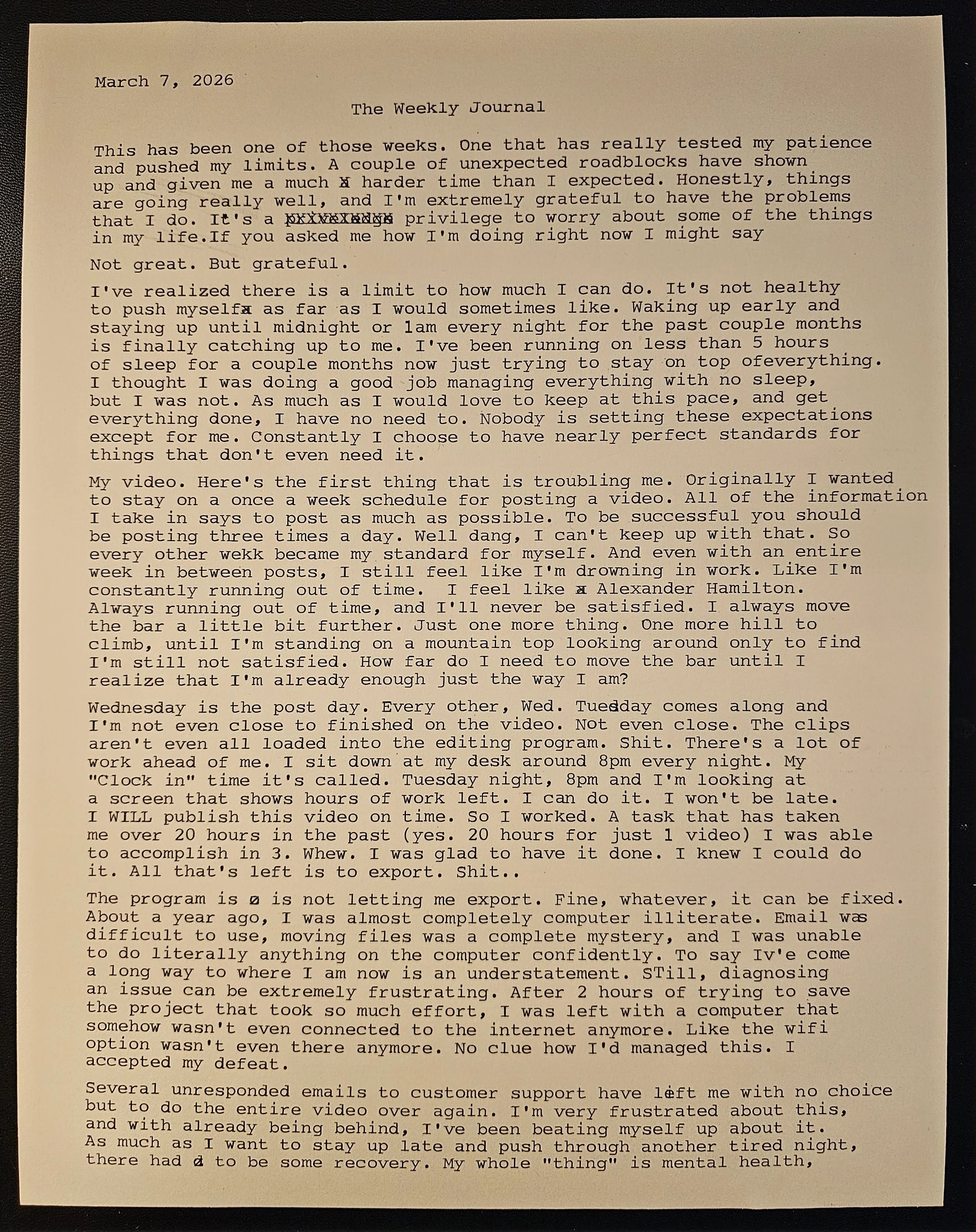 Several unresponded emails to customer support have left me with no choice but to do the entire video over again. I'm very frustrated about this, but with already being behind, I've been beating myself up about it. As much as I want to stay up late and push through another tired night, there has to be some recovery. My whole "thing" is mental health, and yet my own well being has been neglected. Some time with the family has helped me a lot. Really difficult therapy sessions ending in tears have helped me a lot. Taking time for myself has helped me a lot.